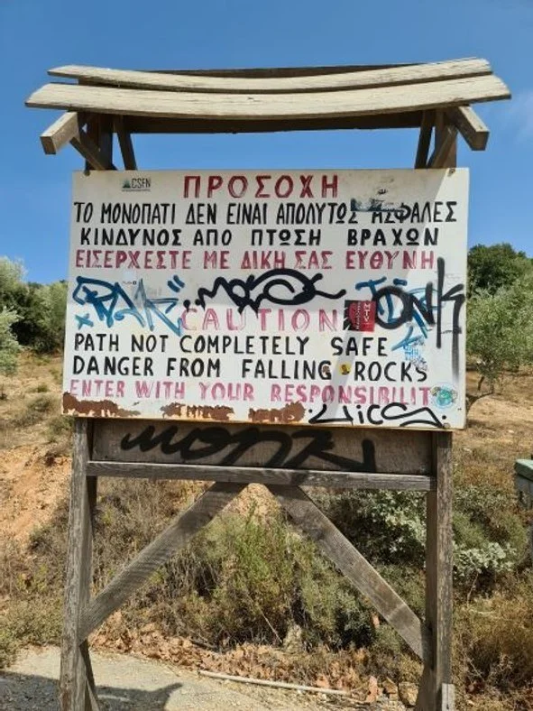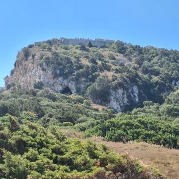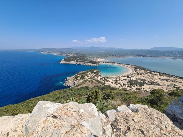 Keeping our promise to return, we were looking forward to hiking up to the old kastro on the headland, down to Nestor’s Cave and cooling off in the beautiful horseshoe bay of Órmos Voidhokoili, and we did. Anchoring in the north end of Órmos Navarinou, we hiked up to the “old” 13th-century Frankish paleokastro, ignoring the "castle closed" signs, before clambering down to the cave. What a cave, huge and high with a hole to the sky - you could feel the neolithic presence, but I did wonder how Hermes had managed to get the cattle stolen from Apollo, up the steep hill. It was midday, it was hot, and cooling off in the bay was a treat before walking back along the brackish lagoon, ignoring "no entry" signs.