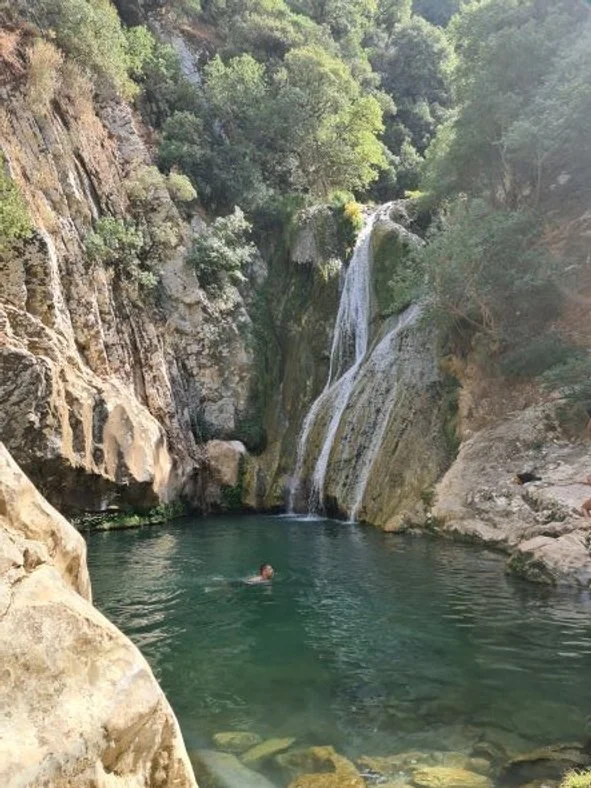 So hiring a car from the only car rental place in Pylos for €70! we spent a day visiting Nestor’s Palace and the hidden Kalamaris and Polylimnio waterfalls via Soulinari village with its sweet smell of sun-drying raisins. The waterfalls were worth the hot trek down to them - green ravines and clear cold water - refreshing beauty. In typical not-many-degrees-of-separation-kiwis, Tommy introduced us to Sarah and Mike from Soul and the six of us dined at Elia in Gialova; a delightful upmarket esplanade of tavernas at the NE end of Órmos Navarinou - the shared meal at Zoe’s taverna with a complimentary geranium flavoured digestive to finish was simply superb.