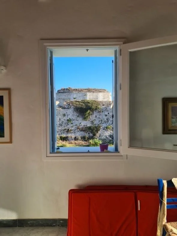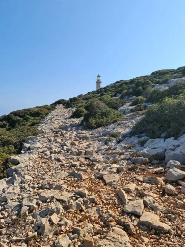 Stopping for a couple of nights in Methoni, we had dinner again at Aléktōr and struck up conversation with a passing Italian couple. They were walking their dog Emma, I pointed out that it was international dog day and long story short - they invited us to their house for a beer the following evening. What a location! Part of their boundary wall is the kastro and their renovated home overlooks the western sea - stunning sunsets. They live in Rome and had been visiting Methoni for a number of years before, by chance, they saw a dilapidated house for sale, so several years and many consents later it has been transformed into a very ordinary Greek looking house with internal Italian chic. Methoni looks across to the island of Sapientza, so with only 67 Greek islands under our belts, we decided to pop over the next night before continuing our journey eastwards. Sapientza is only an hour across, population 0, abandoned fish farms, ibex and a 19th century derelict lighthouse. It was a good 20 minute, rocky zigzag walk up to the lighthouse, which appeared to be unused with its dubious looking solar panels and a batteries, but on dusk – light appeared!